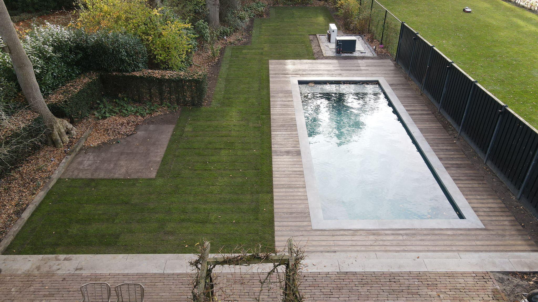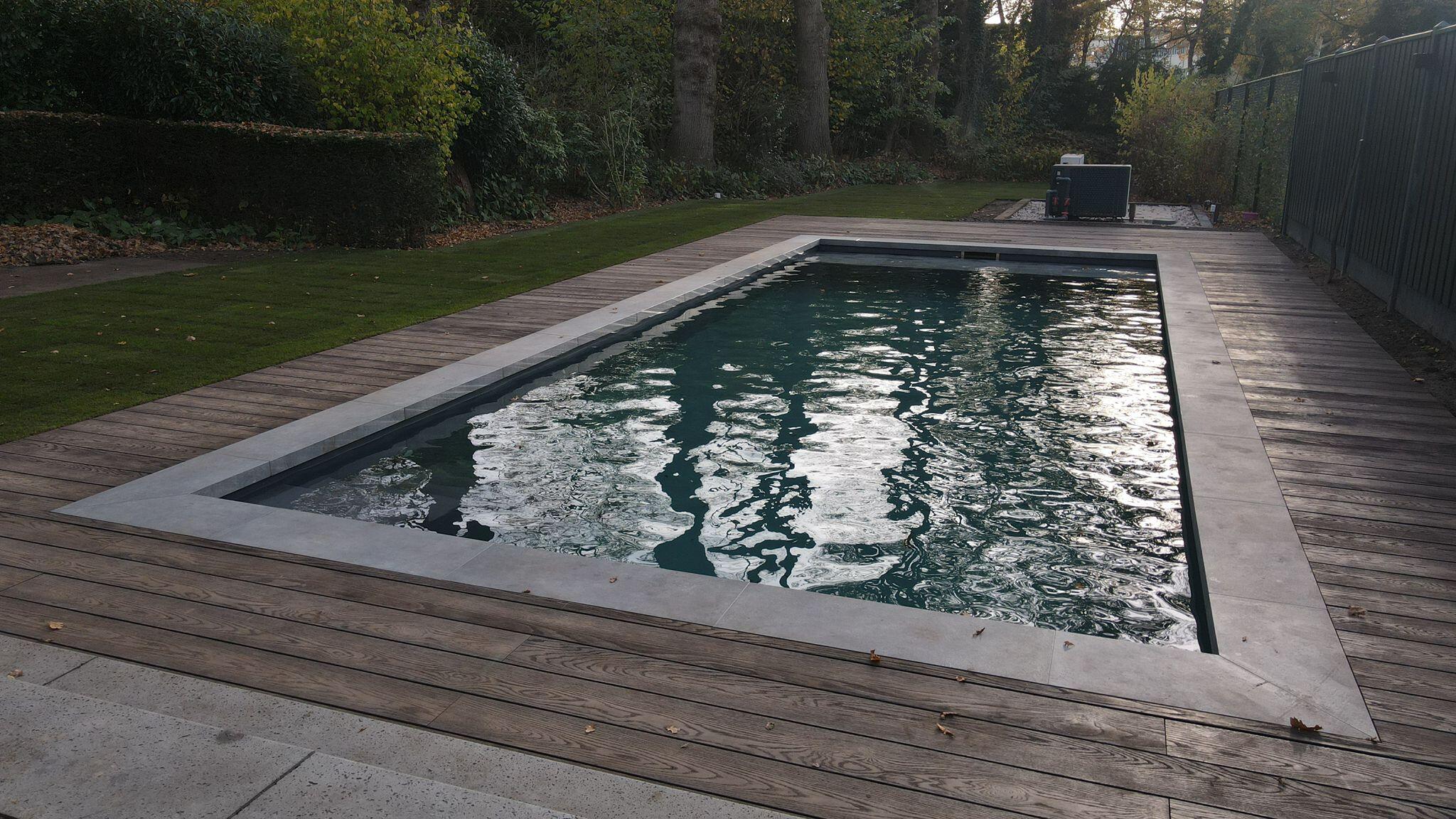 - Hoogwaardige afwerking: Rondom het bad is een onderhoudsvriendelijk Millboard vlonderterras aangelegd, wat perfect matcht met de natuurlijke uitstraling.