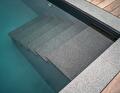 Het werd een bouwkundig bad, 150 cm diep, mét inbouwtrap. Het natuurzwembad is bekleed met een antraciet gekleurde liner. In de lengte van het bad plaatsten we vier lampen. De zwembadranden zijn gerealiseerd in op maat gemaakte natuurstenen-tegels met neus. 30 cm breed, 220 cm lang. Deze grote tegelmaat zorgt ervoor dat het geheel heel rustig oogt. Om het rustige uiterlijk te behouden, hebben we de trap bekleed met dezelfde natuursteen.
